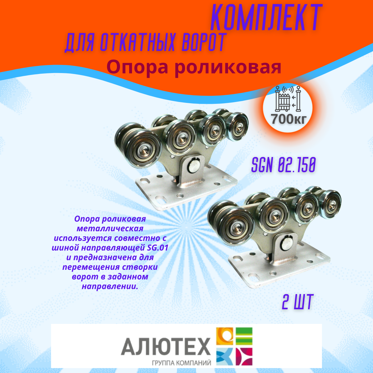- Опора роликовая (стальные ролики) на 700 кг (SGN.02.150) — 2 шт.: Эти усиленные роликовые опоры со стальными роликами рассчитаны на нагрузку до 700 кг. Они обеспечивают плавное и надежное скольжение ворот, равномерно распределяя вес.