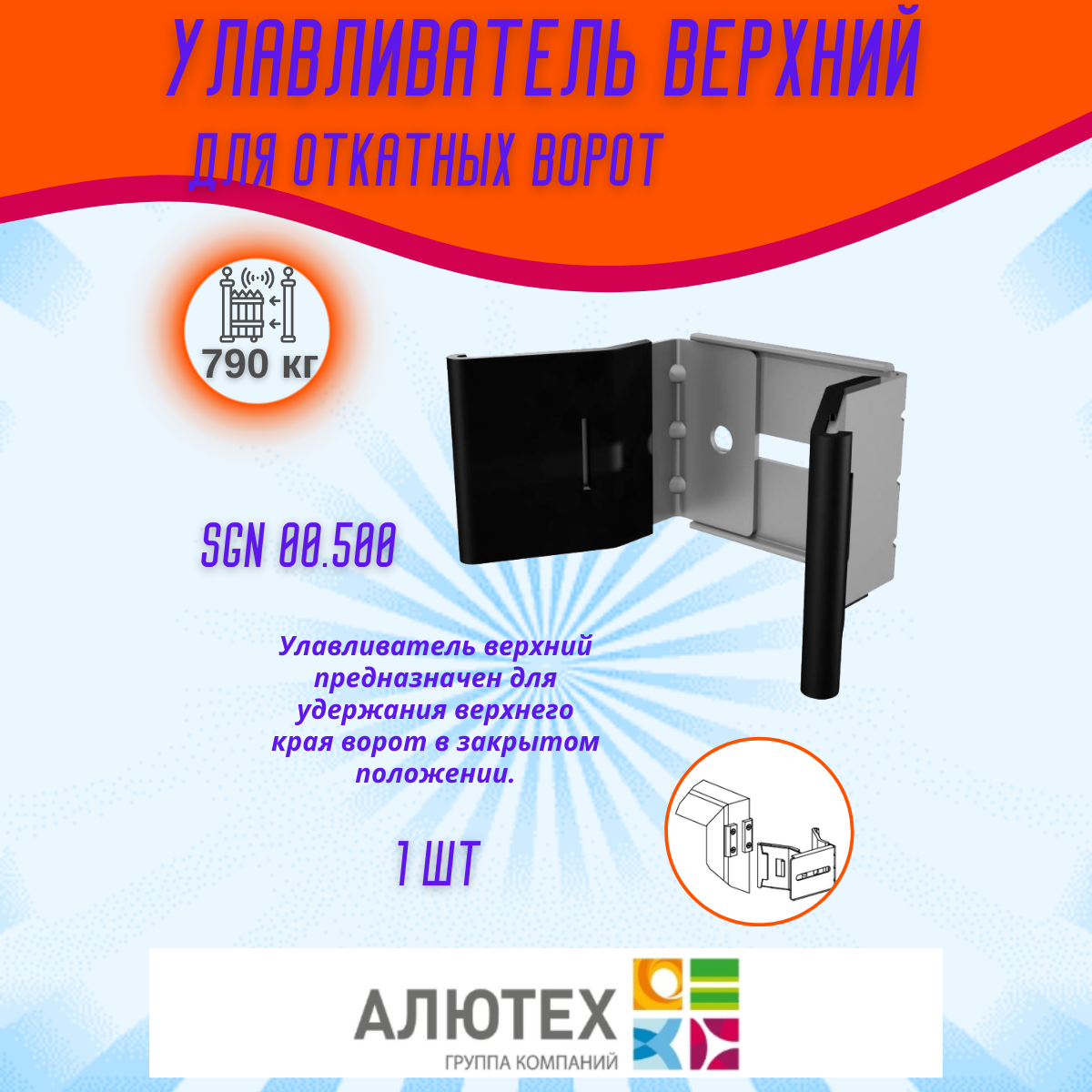 - Улавливатель (ловитель) верхний (SGN.00.500) – 1 шт.: Фиксирует верхнюю часть ворот, когда они закрыты, предотвращая их раскачивание от ветра и обеспечивая дополнительную устойчивость.