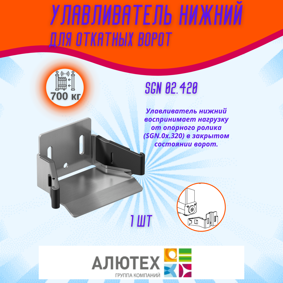 - Улавливатель нижний (SGN.02.420) — 1 шт.: Обеспечивает надежную фиксацию нижнего края ворот в закрытом положении, улучшая их герметичность и безопасность.